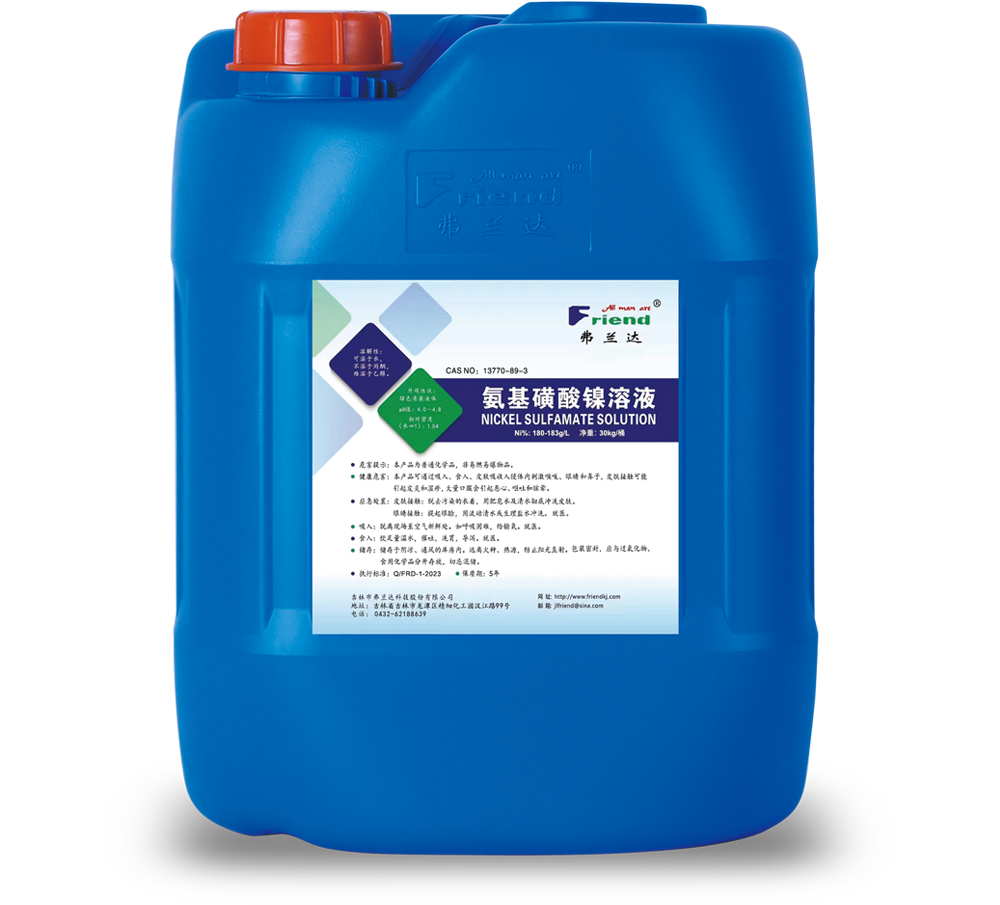 氨基磺酸鎳溶液(Nickel Sulfamate Solution) 分 子式:Ni(NH2SO3)2 分子量:250.87 性  狀:深綠色透明液體。 用 途:主要用于精密電鍍、電鑄、電子工業(yè)等。 包 裝:HDPE桶裝,每桶30公斤。 儲(chǔ) 運(yùn):運(yùn)輸時(shí)包裝要密封,運(yùn)輸過(guò)程中防止受熱,貯存在陰涼,通風(fēng)處。